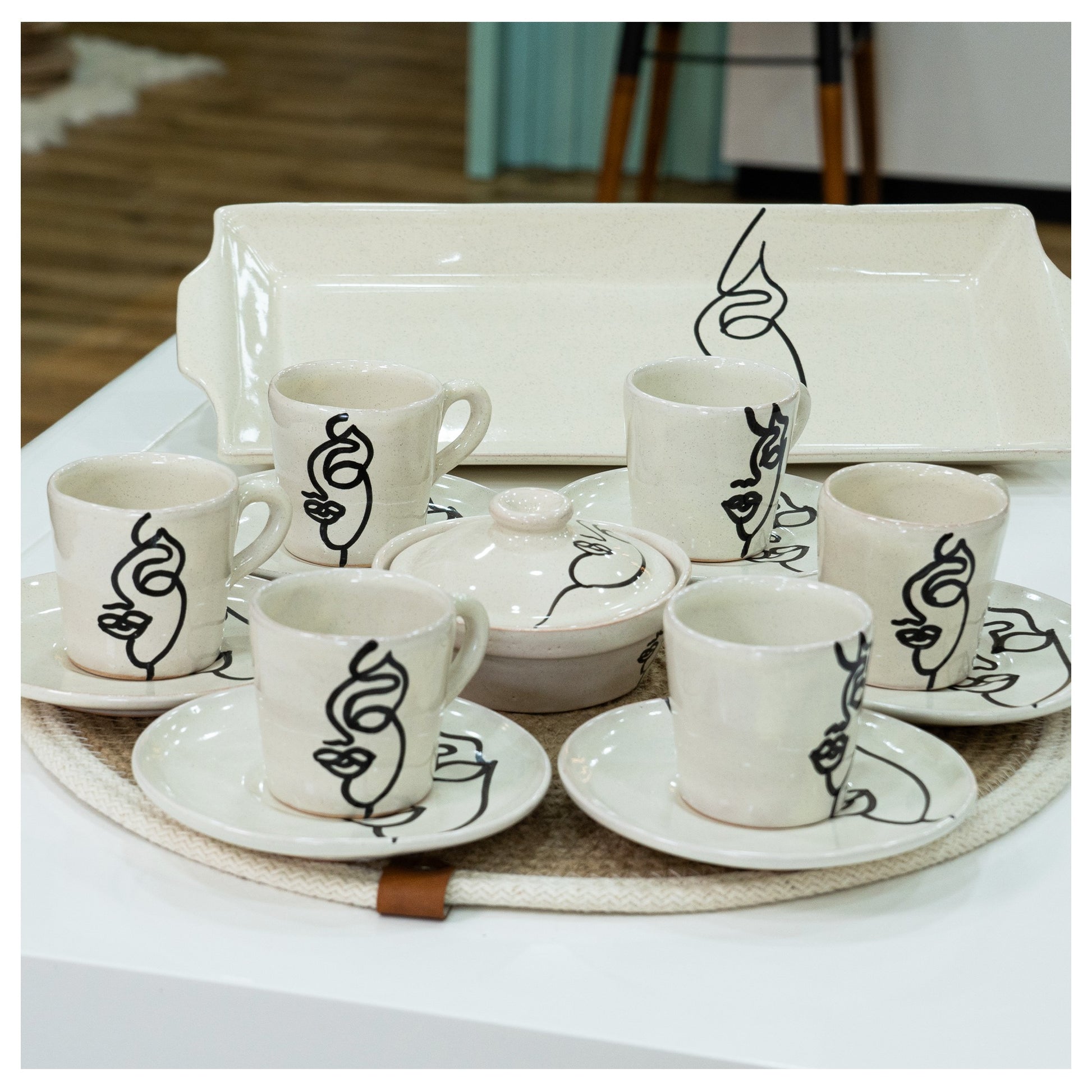 Le Service à Café Face Art est une ode à l’art contemporain. Chaque tasse est peinte à la main avec des traits élégants et minimalistes, offrant une expérience unique à chaque dégustation.